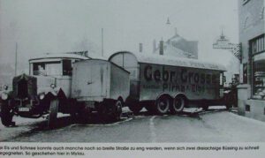 Noch ein letztes Foto von 1928 als sich zwei LKW Büssing vor dem Betriebsgebäude und Tankstelle der Strobels in die Quere kamen: