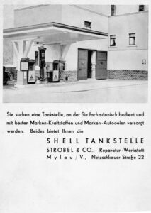 Die Shell-Tankstelle existierte von 1928 – 1947. Willy Strobel musste 1943 in den Krieg und kam 1947 aus der Gefangenschaft zurück. In der Zeit bis 1947 hat sein Co. – Mitbesitzer Fritz Ostertag die Tankstelle betrieben, als dieser 1948 starb wurde die Tankstelle nicht mehr eröffnet.